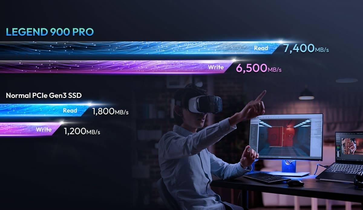 LEGEND 900 PRO sử dụng giao diện PCIe Gen4 x4 thế hệ mới, đạt tốc độ đọc/ghi liên tục lên tới 7.400/6.500MB/s – nhanh gấp 4 lần SSD PCIe Gen3 và gấp 13 lần SSD SATA truyền thống.